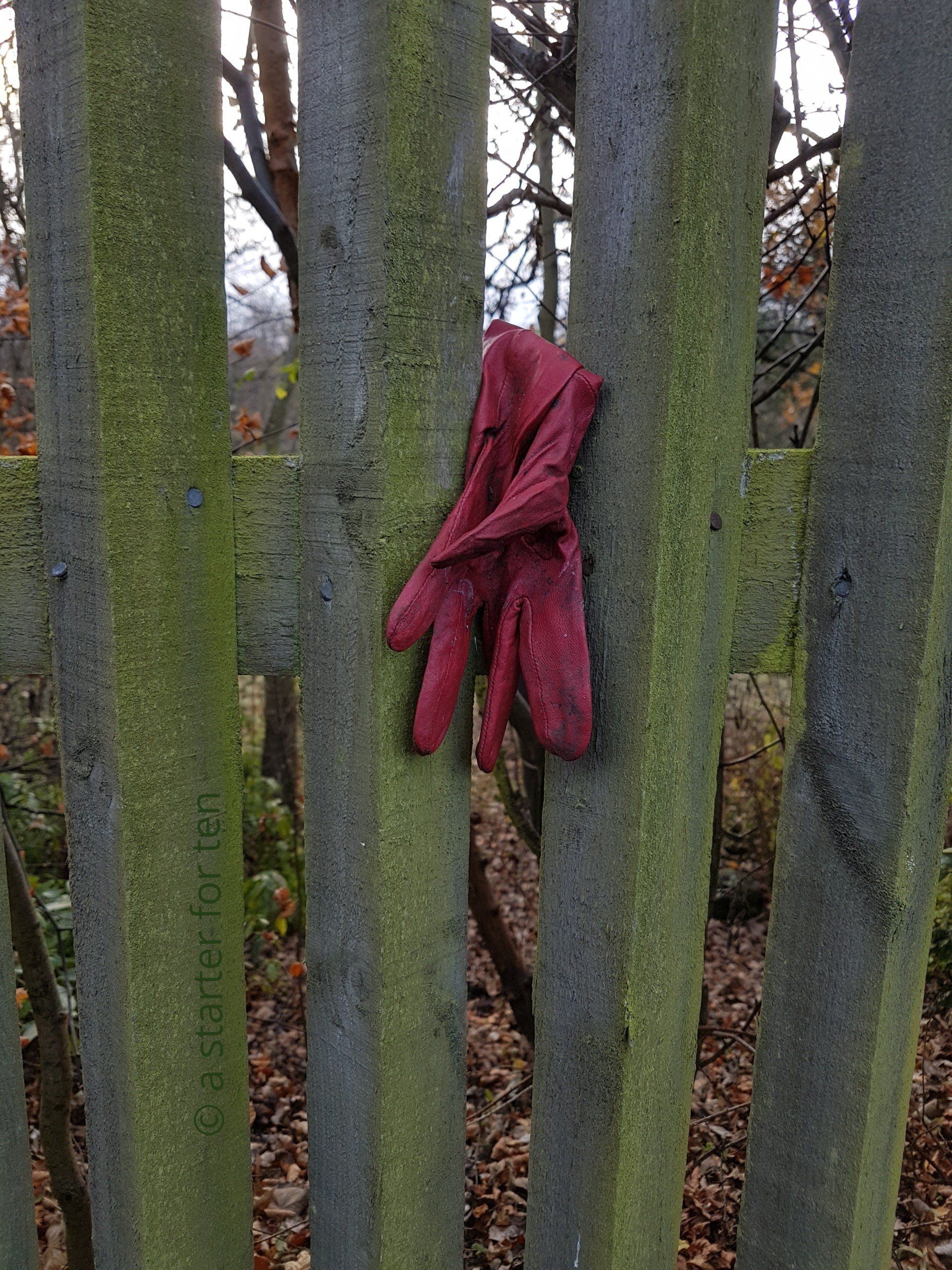 I'm always amazed by items of clothing left at the side of the road - has someone really gone home with only one shoe, or one glove and didn't realise? Seeing a glove, coat, or teddy stuck onto a fence or a wall always gives you hope that one day they will be reunited with their owners. This glove was stuck into the gap in a fence when I was on my way home from town - I'm hoping the owner found it and it wasn't actually there as a sign - other than a hint to get me to write another story starter.